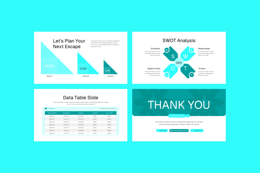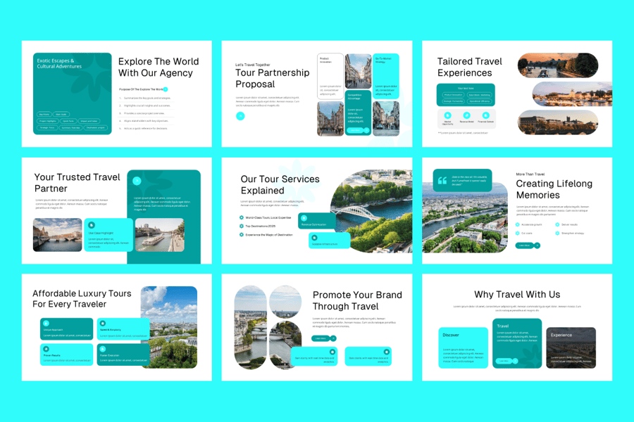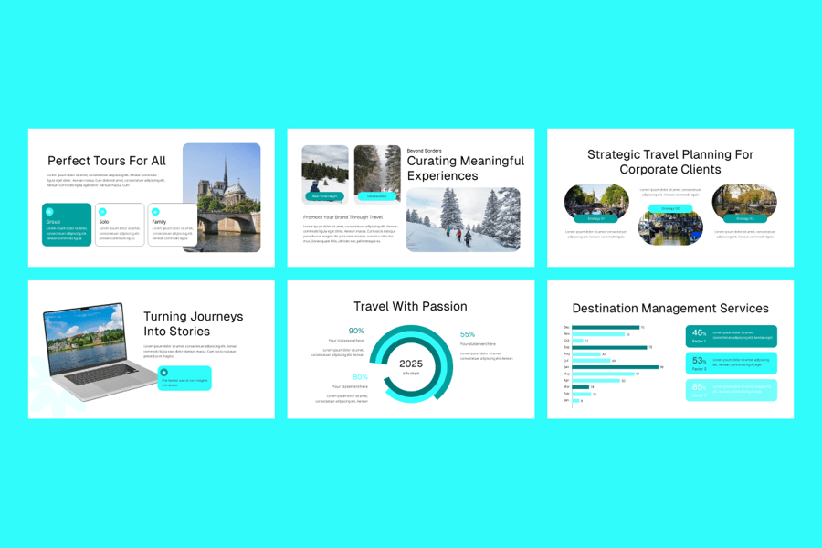 使用这款旅游公司谷歌幻灯片演示模板,以时尚的方式推广您的旅游业务。这是一款现代、专业且完全可定制的演示文稿模板,专为旅游运营商、旅行社、目的地营销人员和旅游创业公司设计。这款简洁的模板可帮助您通过引人入胜的幻灯片展示旅游套餐、目的地、行程安排和营销策略。