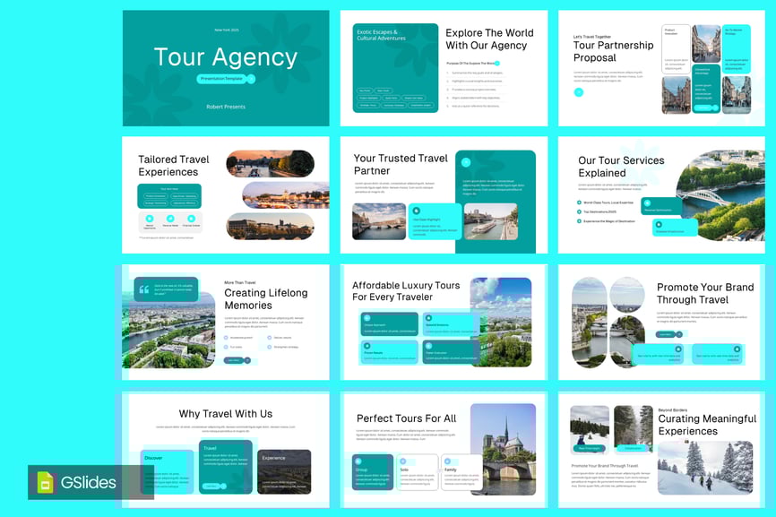**旅行社谷歌幻灯片模板 – 现代旅游业务演示文稿,适用于旅游营销和旅游套餐。**