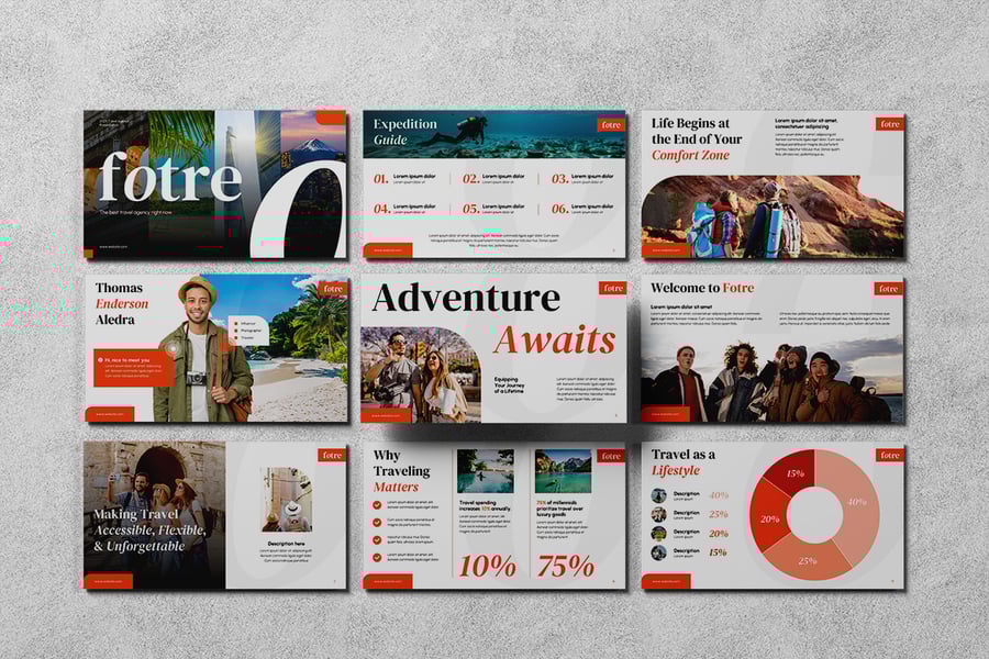 使用旅行社主题演讲模板,让您的旅行梦想成真。该模板采用色彩丰富的布局和引人注目的视觉效果,旨在以极具冲击力的方式展示目的地、旅行套餐和行程安排。重点突出基于应用程序的便捷预订和安全支付选项,让旅行计划轻松无忧。对于希望以创意、清晰和现代的方式展示服务的旅行社、旅游运营商和初创公司而言,这款模板堪称完美之选。
