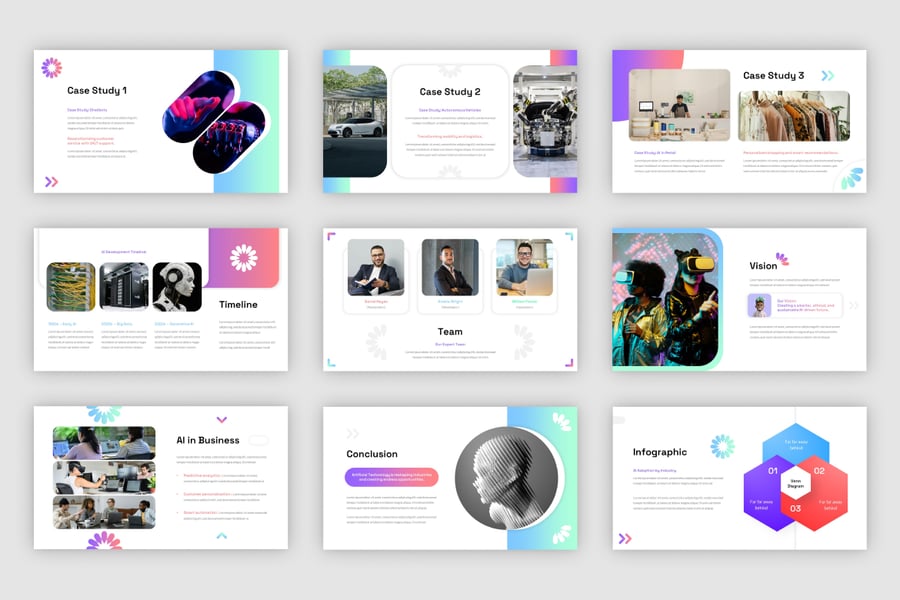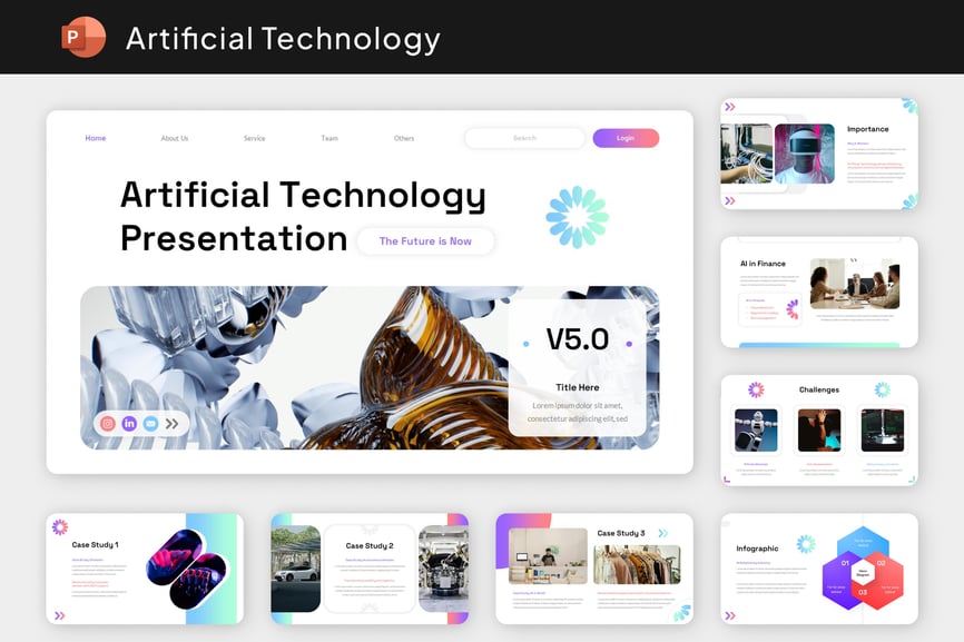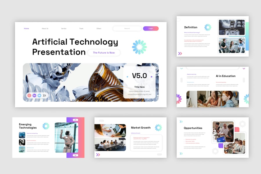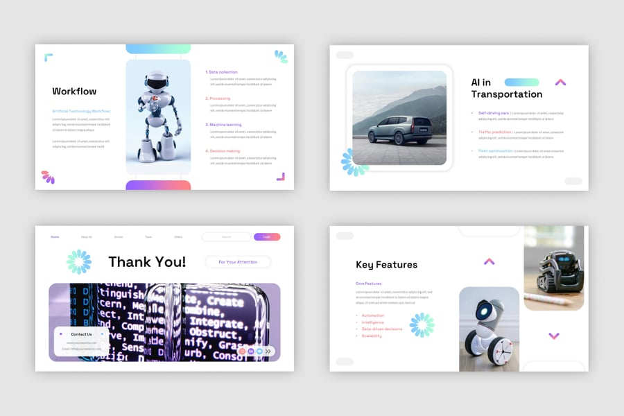 这款人工智能技术 PowerPoint 演示模板可帮助您精准、直观地展示自动化、人工智能和数字化转型方面的前沿理念。该模板专为科技初创公司、创新团队、商业战略家和数据分析师设计,提供现代化的数据驱动型布局,简化复杂主题。通过清晰的图表和引人入胜的视觉效果,展示人工智能工作流程、机器学习模型、分析仪表板和自动化案例研究。