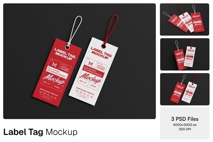 标签样机是一款高质量的 Photoshop 模板,旨在以优雅逼真的方式展示您的服装、服饰或产品标签设计。此样机包包含 3 个 PSD 文件(4000×3000 像素,300 DPI),图层组织清晰,并具备智能对象功能,让您轻松快速地插入您的设计稿、徽标或文字。