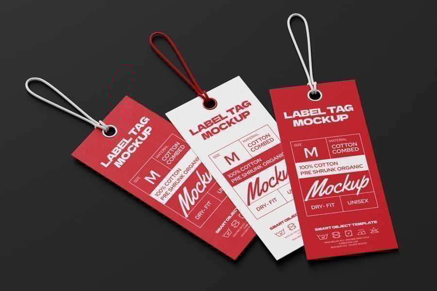 该设计以逼真的布艺吊牌为特色,吊牌上带有绳索,排列在简洁的深色背景上,突显了设计的纹理、对比度和印刷细节。此模板非常适合时装设计师、服装品牌和标签制造商,有助于将品牌概念可视化,用于服装吊牌、纺织配件或零售包装。