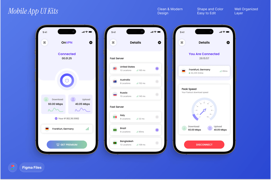 **互联网速度分析器和 VPN 移动应用 UI 套件**