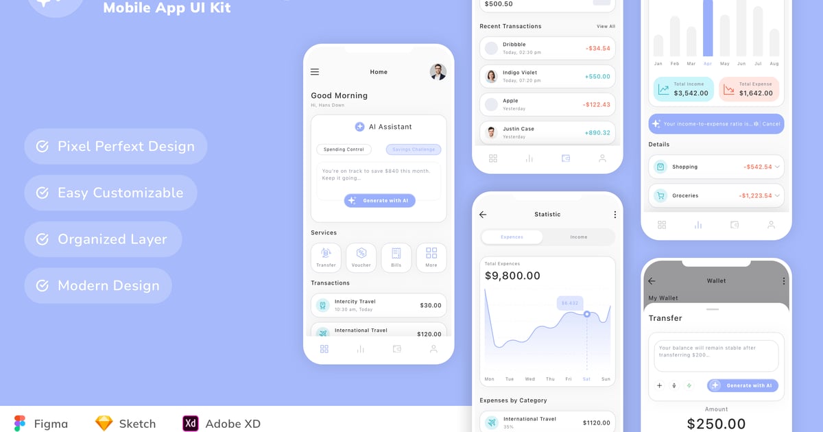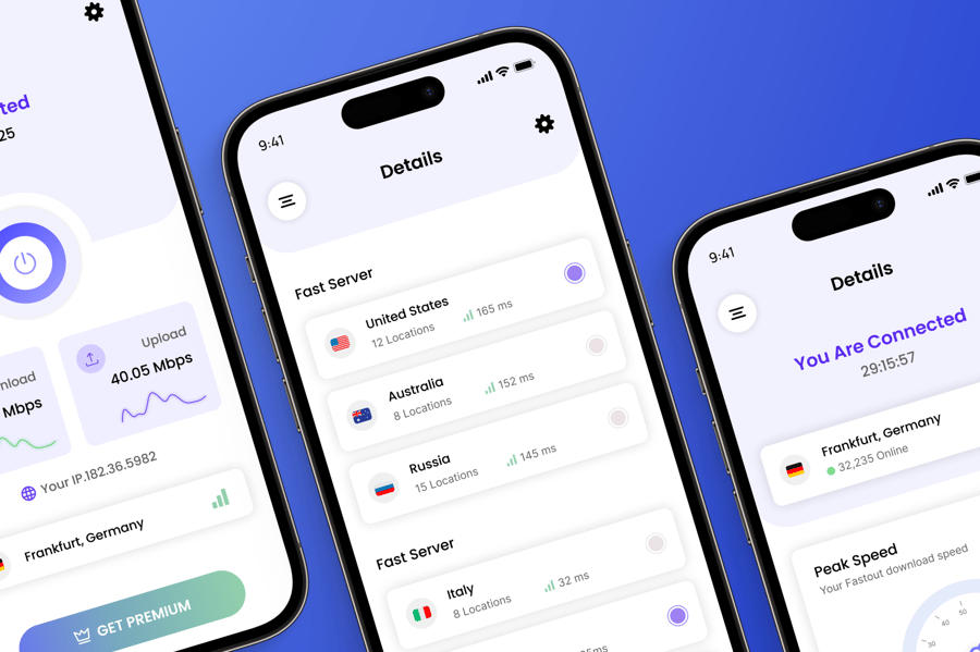 这款移动 UI 套件专为连接和安全平台而设计,采用简洁的布局,可用于网络速度分析和 VPN 服务。它使开发人员能够创建应用程序,帮助用户轻松监控带宽、优化互联网使用并确保安全浏览。该套件适用于消费者工具、企业安全解决方案或科技初创公司产品,可确保在各种数字设备上提供流畅的界面,传递信任、可靠性和高性能。