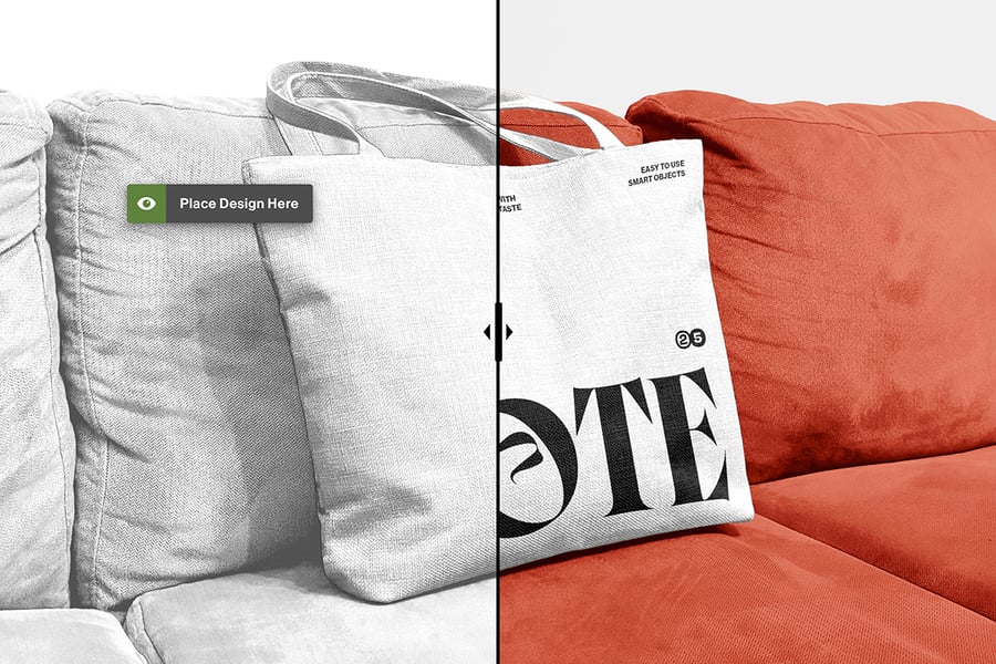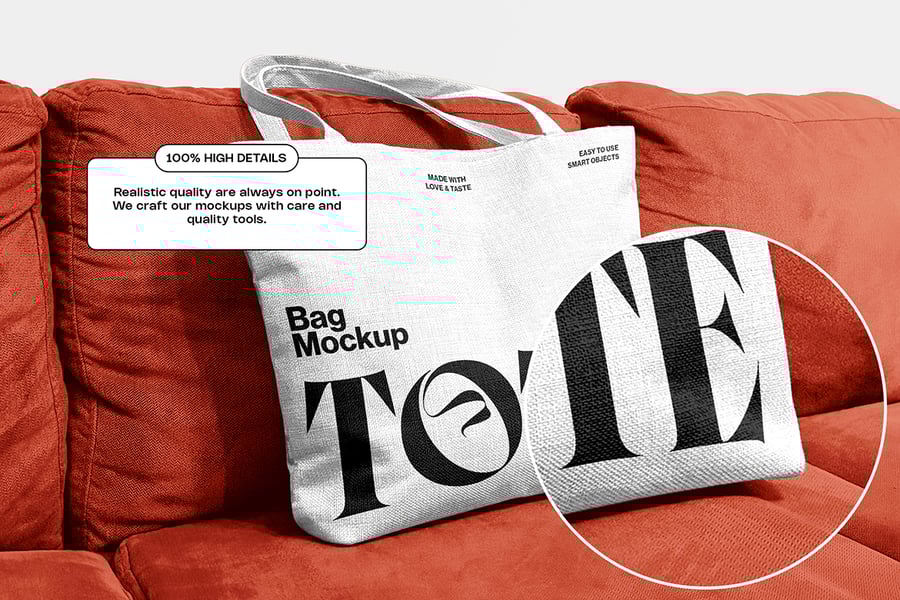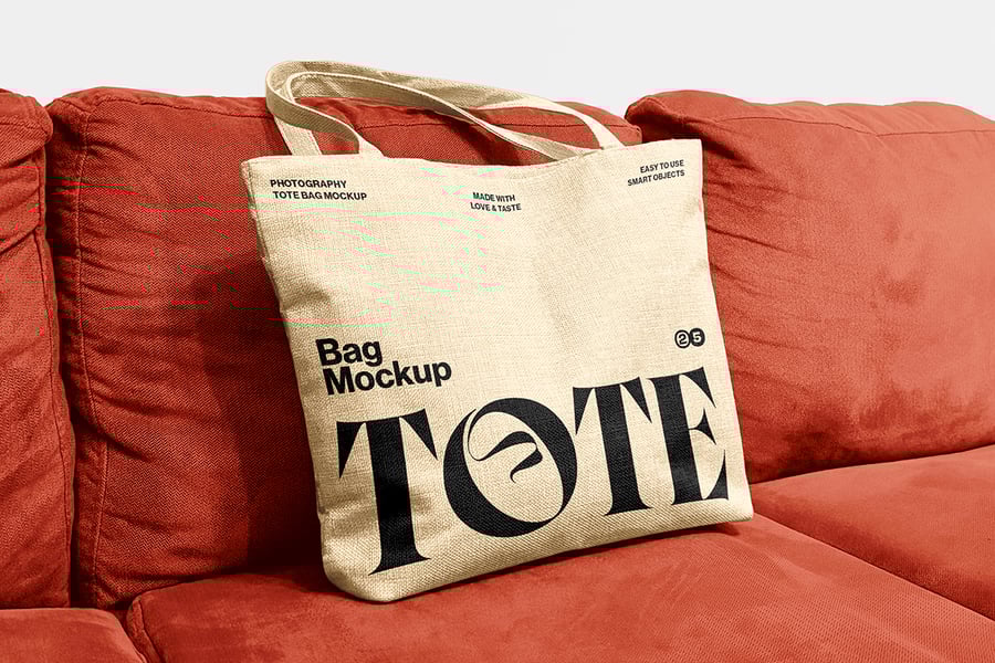 一款逼真的手提袋模型,拍摄于沙发场景中。这款高质量的摄影模型支持使用智能对象轻松放置设计元素,非常适合用于品牌展示、产品展示或生活方式视觉呈现。