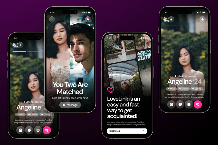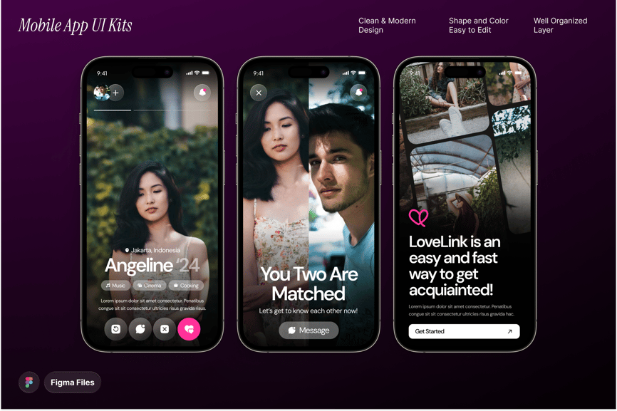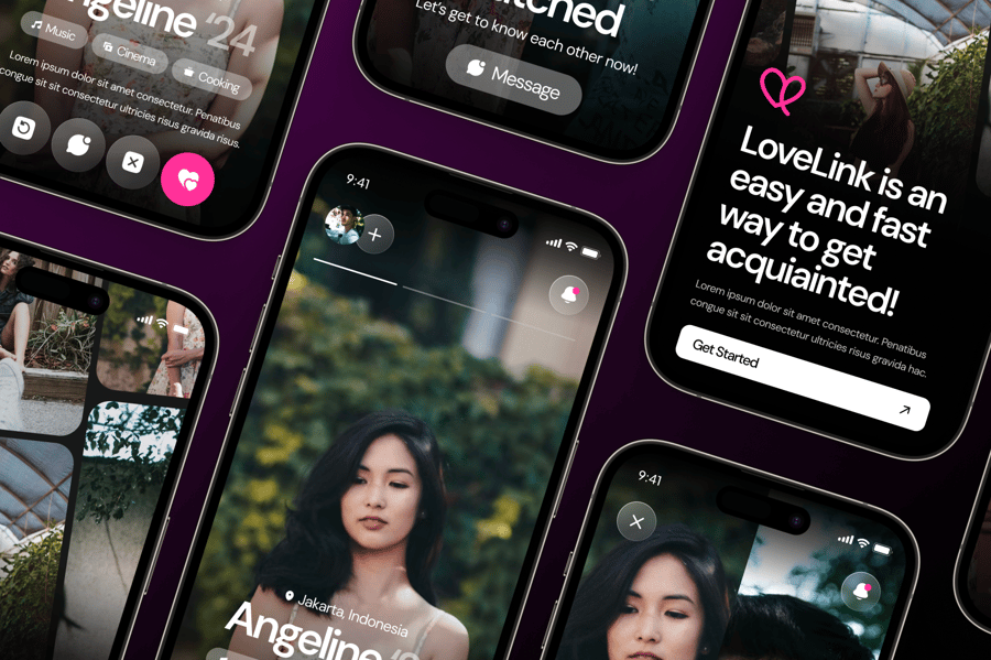LoveLink 提供一套时尚且富有情感的移动端 UI 套件,专为婚恋交友和情感关系平台量身打造。它采用简洁明了、富有表现力的界面,使用户互动自然流畅、引人入胜且值得信赖。这套套件非常适合打造现代社交体验,例如婚恋服务、情侣应用或交友工具,并在整个界面中营造出温馨且以用户为中心的体验流程。