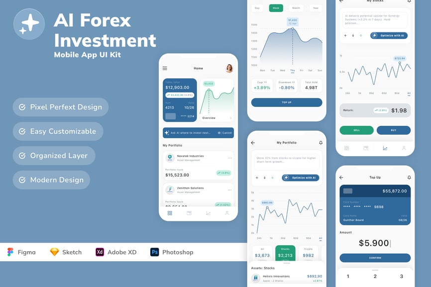 每个屏幕都可完全自定义,易于使用,并针对 Figma、Sketch 和 Adobe XD 进行了精心设计。