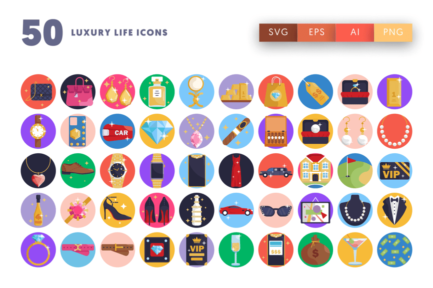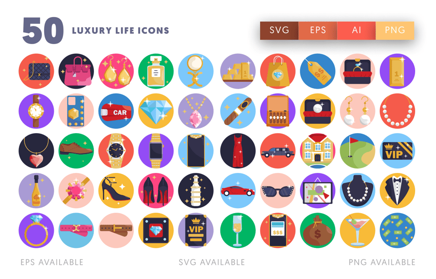 探索这套包含 50 个奢华生活图标的精美矢量符号,它们象征着财富、时尚和精致。非常适合用于品牌推广、设计项目以及展示高端生活方式。