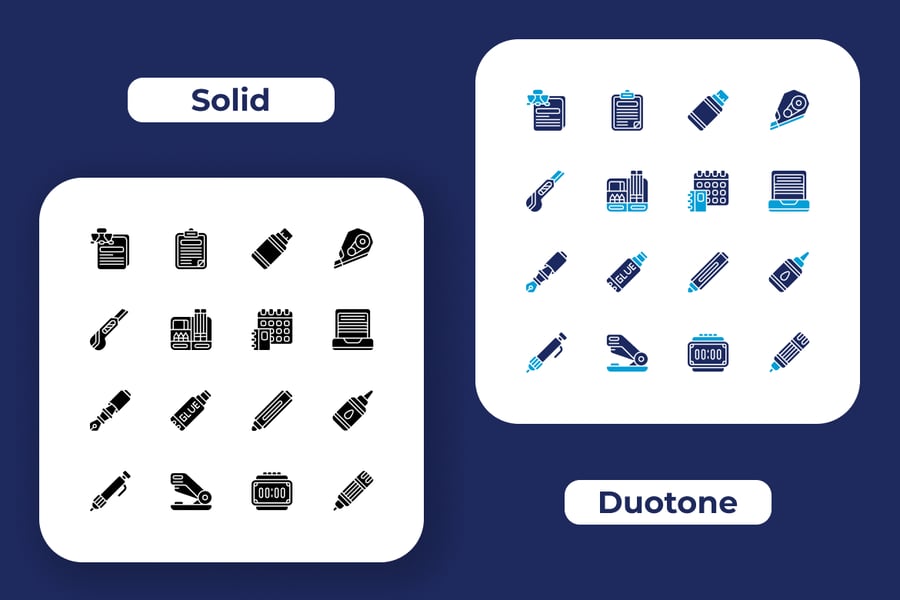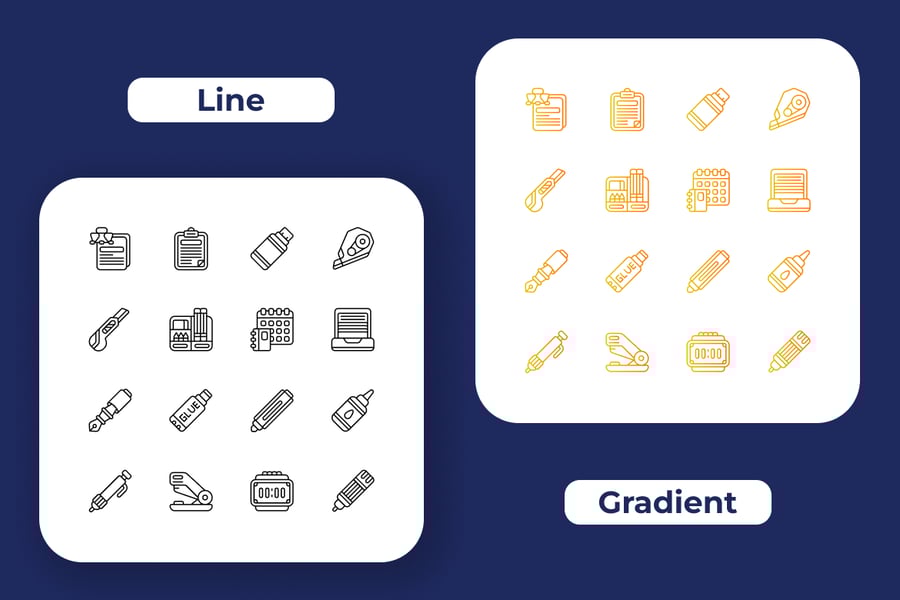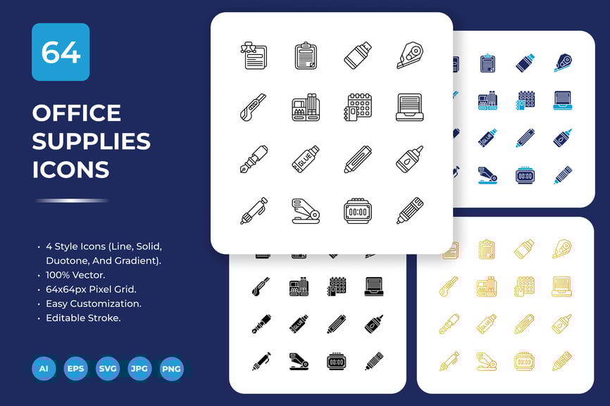 一套现代且用途广泛的图标包,适用于网站、移动应用、书籍、社交媒体、信息图表、传单、印刷品、横幅、海报等多种用途。包含 64 个图标,分为 4 种样式:线条、实心、双色调和渐变。