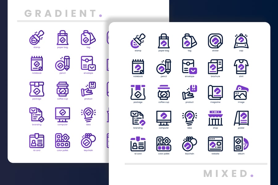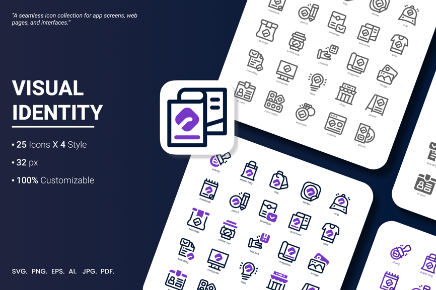 **视觉识别图标包**包含100个时尚图标,展示了热门服务和理念。它非常适合用于网站设计、移动应用程序、演示文稿、分析报告、信息图表和模板。