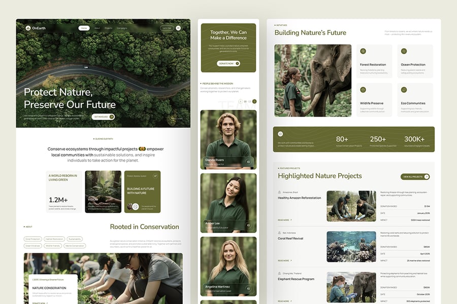 从极具电影感的横幅广告到目标明确的内容板块,OnEarth 的每一个元素都经过精心设计,旨在清晰而感人地传达环保目标。它不仅仅是一个网站,更成为您使命的数字化家园,展示正在进行的项目、社区参与和环境进展。无论您是发起一项活动、推广植树造林计划,还是重点介绍环保项目,OnEarth 都能为您提供坚实的基础,让您以真诚和感性的方式讲述您的故事。