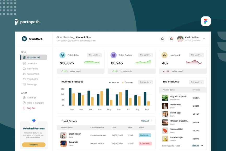 专为电商管理和分析设计的仪表盘 UI 模板。简洁的界面布局使用户能够轻松管理产品、查看销售业绩并整理产品类别。非常适合家具、家居装饰和生活方式类网店平台。该模板基于 Figma 构建,采用专业直观的设计,注重易用性和视觉清晰度。是设计师、开发者和初创公司创建管理后台或 Web 应用的理想之选。