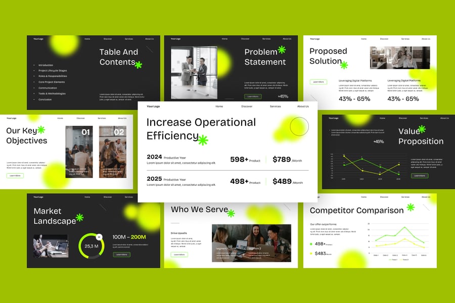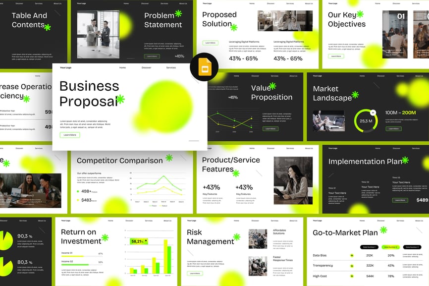 使用这款商业计划书谷歌幻灯片演示模板,以简洁专业的演示打动客户和投资者。这款现代且功能全面的幻灯片模板非常适合企业家、初创公司、咨询顾问、企业团队和营销机构,助您自信清晰地展示您的商业理念、解决方案和策略。