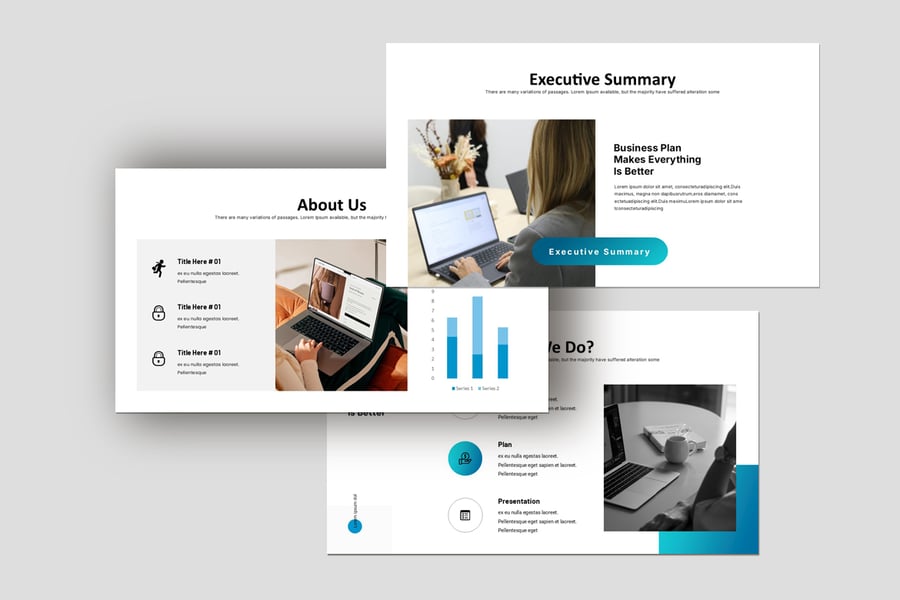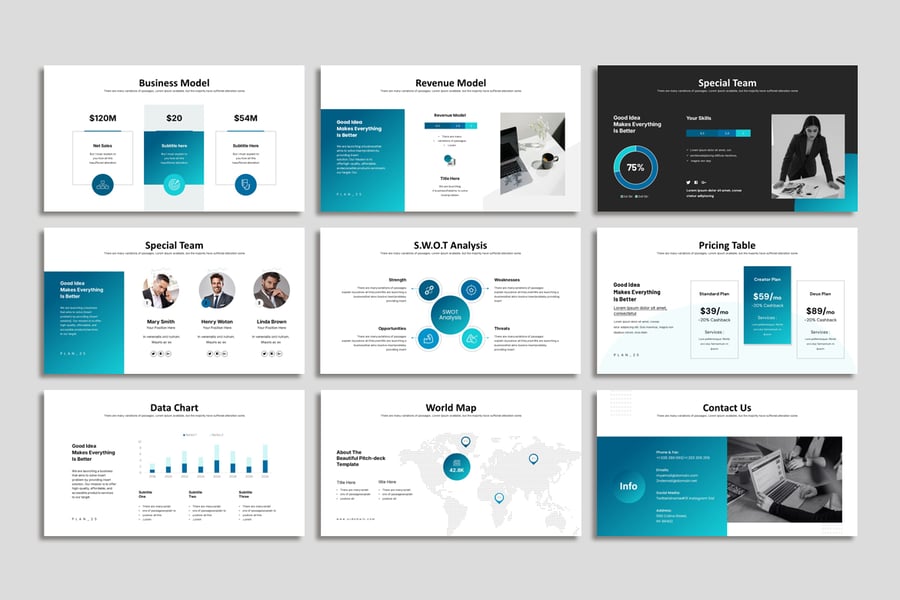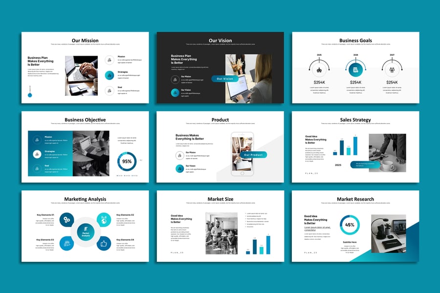 获取一款设计精美、功能齐全、专为商业计划打造的现代化专业演示文稿模板。该模板包含信息图表、图表、地图、设备展示和图标等元素。这款模板用途广泛,适用于各种类型的企业。丰富的幻灯片数量足以满足您制作完整演示文稿(商业计划书)的需求。