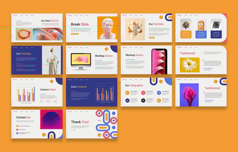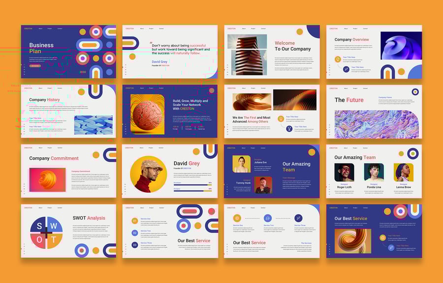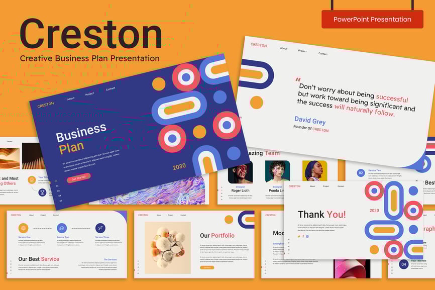 Creston 是一款现代且富有创意的演示模板,旨在帮助您清晰、自信且时尚地展示您的商业计划。