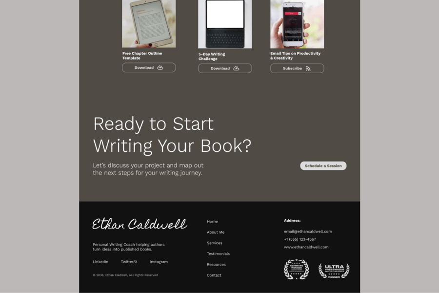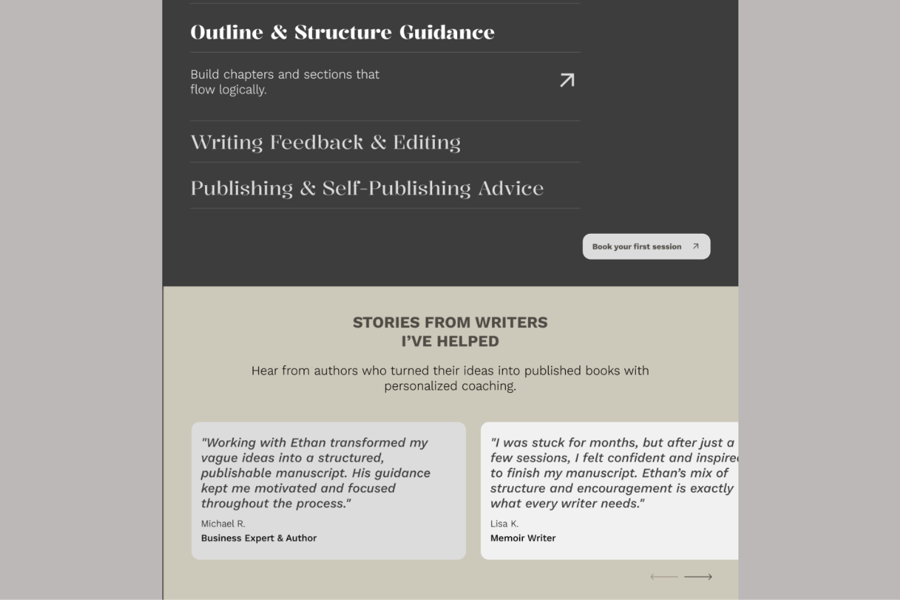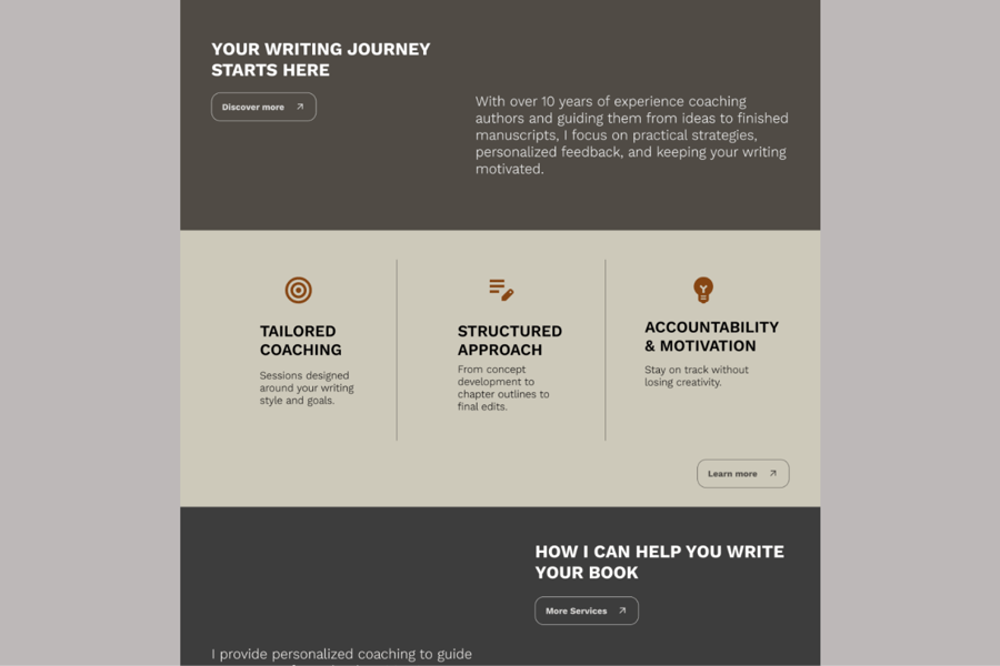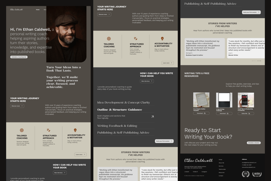 这款单页 Figma 模板专为写作教练、作家和私人导师设计,旨在以简洁易懂的布局展示他们的服务、专业知识和客户成功案例。它非常适合建立信任、突出服务并吸引访客转化为客户。