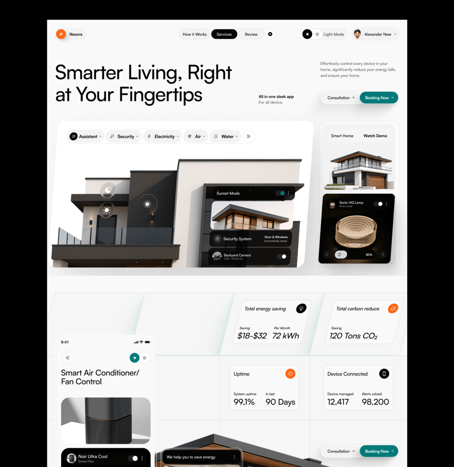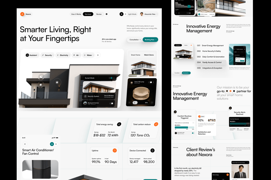 Nexora 是一家智能家居科技公司的网站登陆页面 UI 套件。登陆页面包含 6 个部分,分别是:首页、智能空调、我们的服务、创新能源、用户评价和页脚。