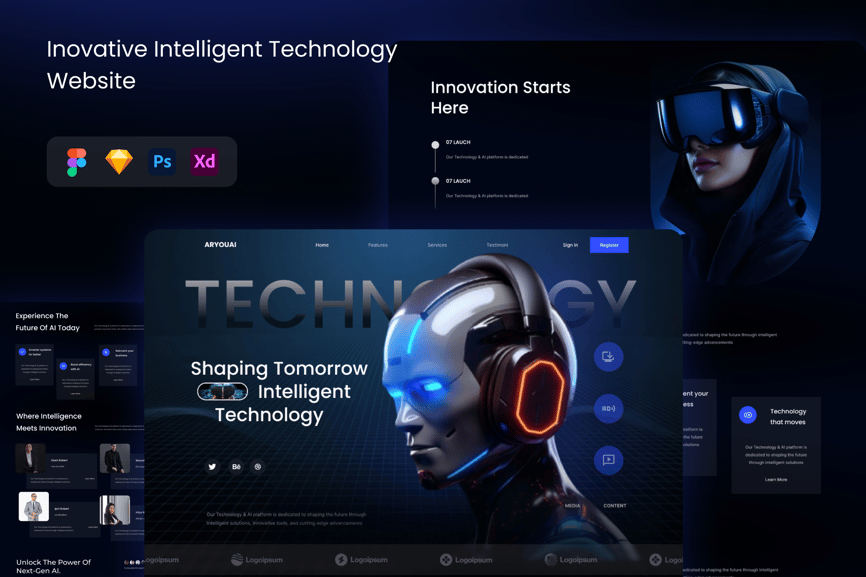 **Aryouai – 创新智能科技网站** 此模板简洁却不失专业现代感。您可以使用 Figma、Adobe XD、SKETCH 和 Adobe Photoshop 进行编辑。轻松插入内容、更改颜色,所有模板均已包含,可随时与您的受众分享。所有组件均基于矢量,完全兼容、可编辑且像素完美。此外,它们组织有序,命名和分组均经过精心设计。