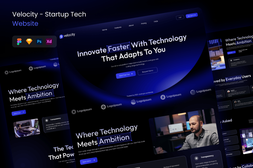 **Velocity – 初创科技网站** 此模板简洁却不失专业现代感。您可以使用 Figma、Adobe XD、Sketch 和 Adobe Photoshop 进行编辑。轻松插入内容、更改颜色,所有模板均已包含在内,可直接分享给您的受众。所有组件均基于矢量图,完全兼容,可编辑且像素级精准。此外,所有组件都经过精心组织、命名和分组。