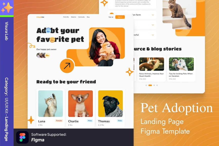 这款宠物领养落地页 Figma 模板设计精美,用户友好,旨在帮助动物收容所、救助中心和领养平台为宠物找到温暖的家。凭借其现代化的响应式布局,该模板确保跨设备流畅的用户体验,方便访客浏览待领养宠物、了解领养计划并采取行动。该模板基于 Figma 构建,采用结构清晰的组件和可编辑图层,设计师和机构可以快速自定义颜色、字体和布局,以契合其品牌形象。这款模板非常适合非营利组织、宠物领养服务机构或动物权益倡导活动,它将实用功能与温馨的设计相结合,旨在赢得信任和参与。