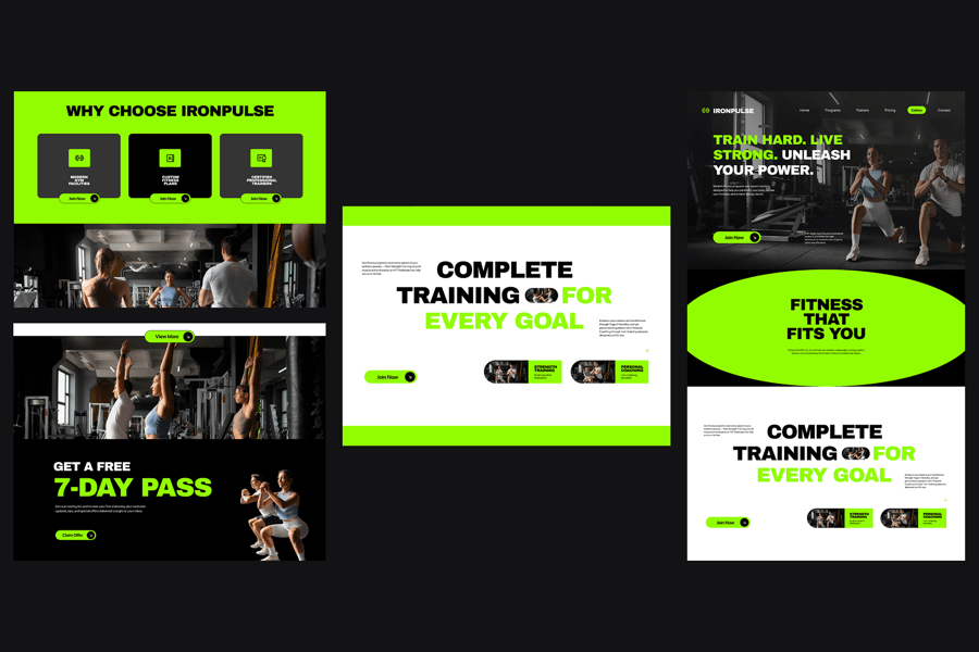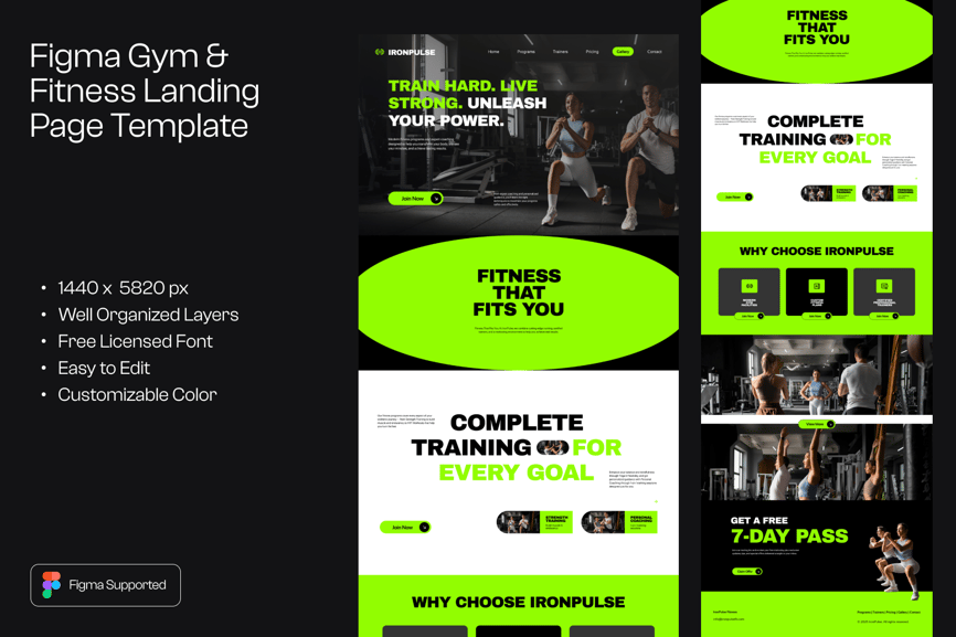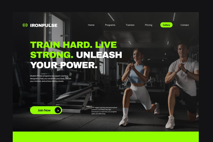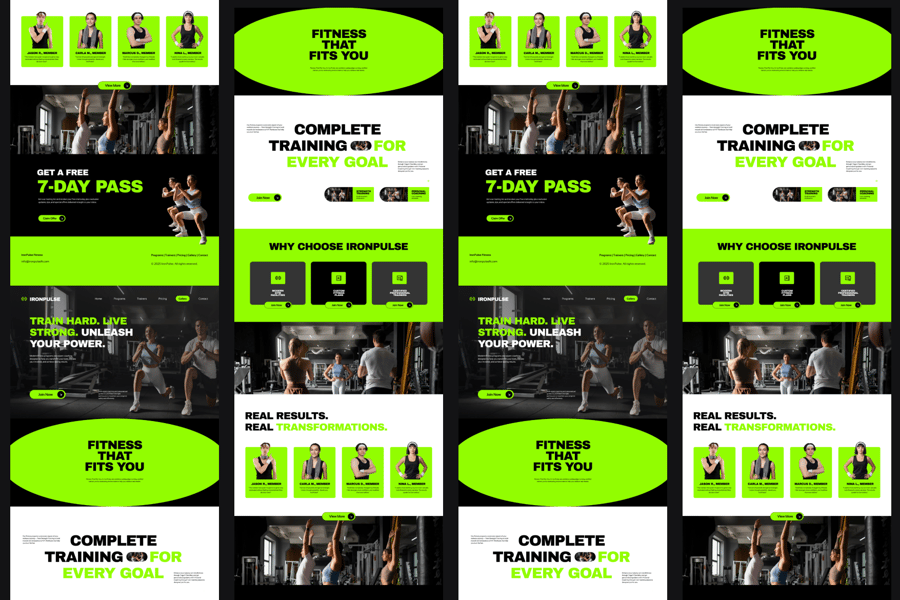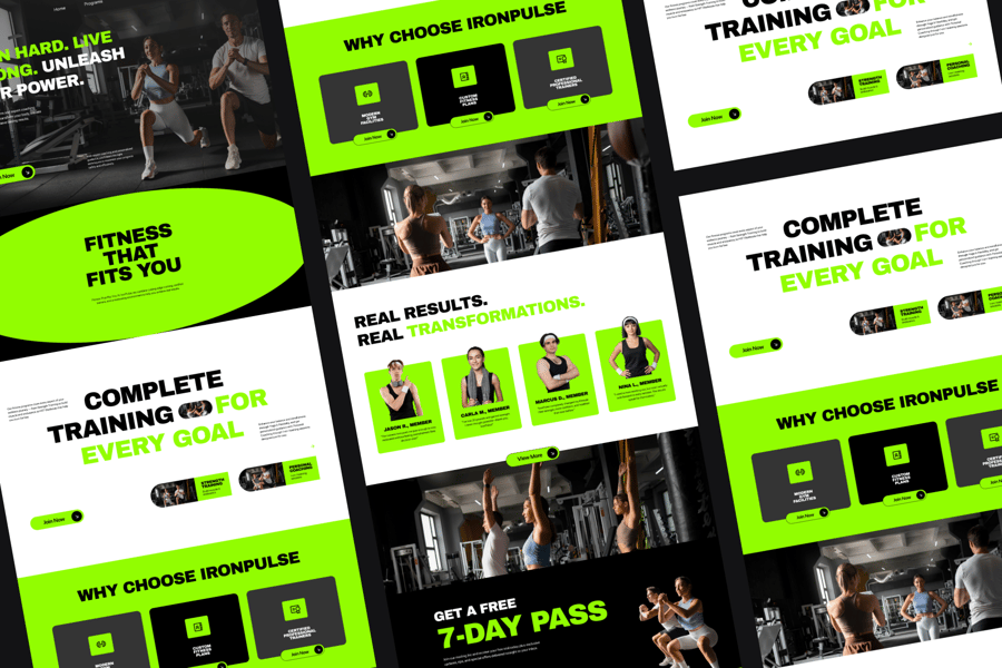 隆重推出 IronPulse,一款专为健身房、健身中心和私人教练打造的活力四射的 Figma 落地页模板。它包含课程表、客户评价和会员招募按钮,旨在将访客转化为会员。