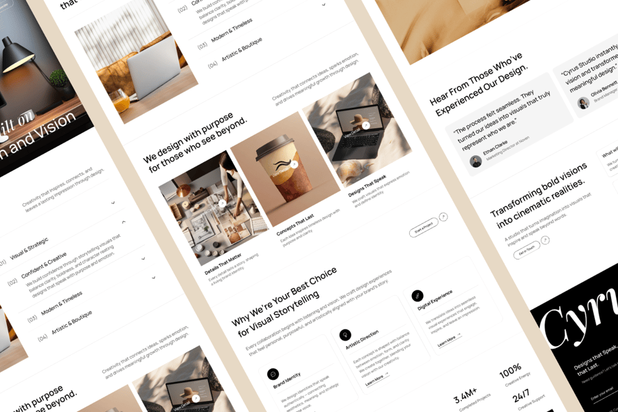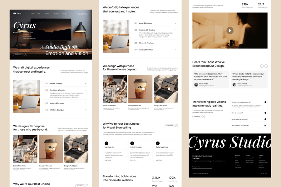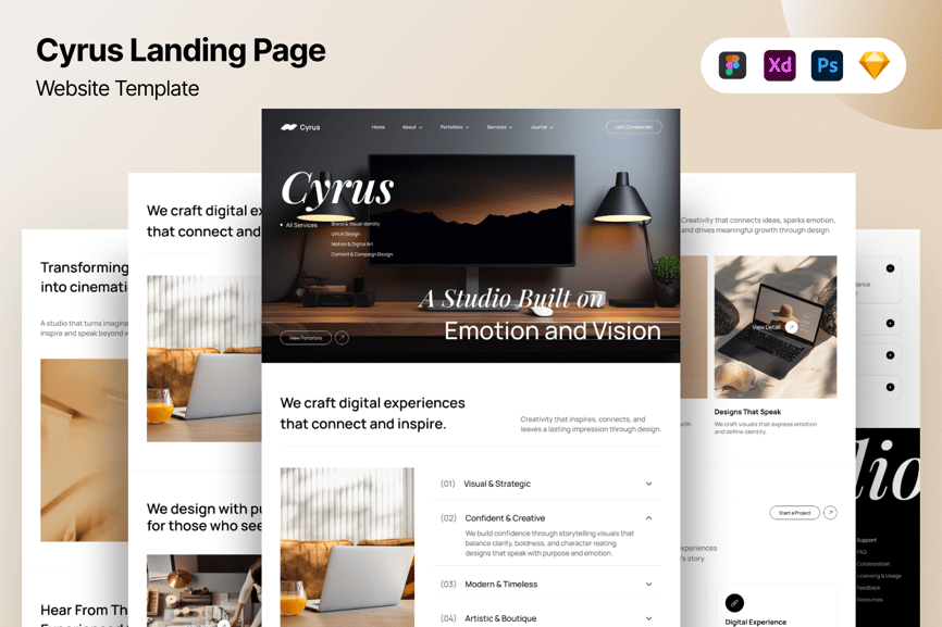 使用 Cyrus 打造精致的数字化形象。Cyrus 是一款专为创意工作室、设计机构和数字专业人士设计的高端落地页模板。凭借其电影般的布局、柔和的色调和叙事性的结构,Cyrus 能帮助您优雅而富有感染力地展示您的作品集、服务和品牌故事。