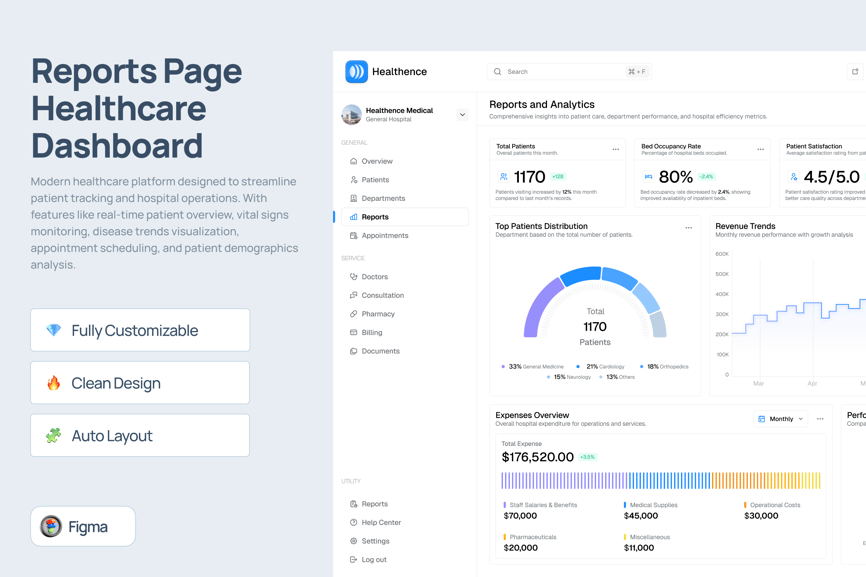 Healthence 是一款简洁、现代且设计精美的医疗保健仪表盘报告页面,包含高质量的屏幕。Healthence 易于定制,可满足您的各种需求。它提供浅色模式,并且在 Figma 中也易于使用。
