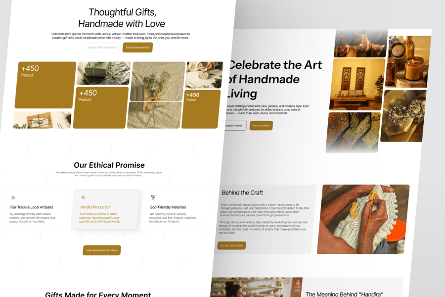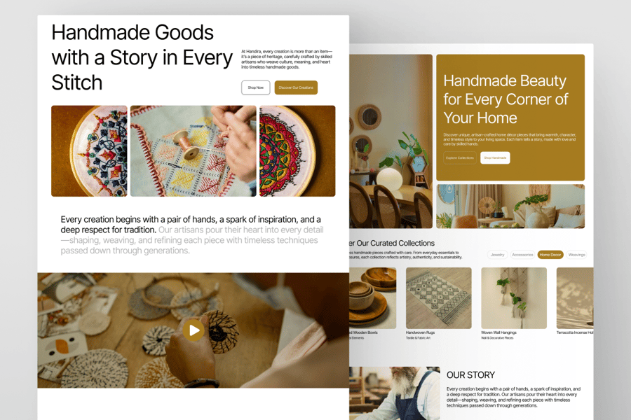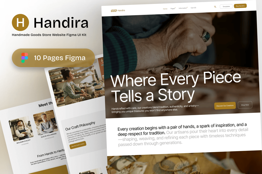 Handira 是一款设计精美的 Figma 手工制品商店网站 UI 套件,专为工匠、工艺品商店和创意小型企业打造。Handira 拥有温馨宜人的美学风格,能够以优雅且用户友好的方式,帮助您展示手工制品、作品系列、产品详情、价格、客户评价和在线商店功能。