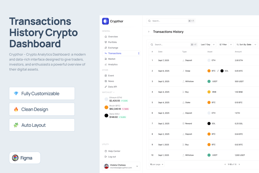 Crypthor 是一款交易历史加密货币仪表盘,设计简洁现代,包含高质量屏幕。Crypthor 易于定制,可满足您的各种需求。提供浅色模式,并可在 Figma 中轻松使用。