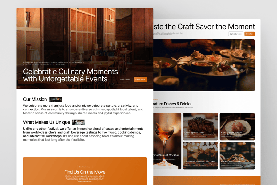Trucksy 使用 Figma 自动布局、可重用组件和响应式网格构建,可为任何餐饮品牌或餐饮概念提供无缝定制。