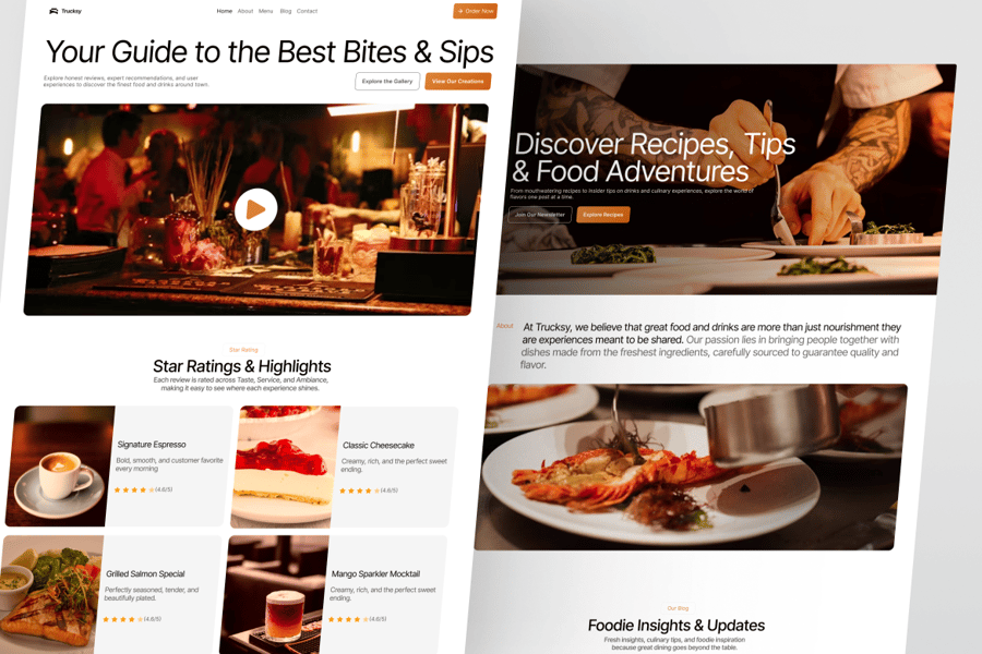 Trucksy 是一款时尚诱人的餐饮餐厅网站 Figma UI 套件,专为餐车、咖啡馆和现代餐饮企业量身打造。Trucksy 拥有充满活力的布局和温馨的美学设计,助您以极具吸引力的视觉效果展示菜单、招牌菜、主厨推荐、在线订餐、价格、客户评价和联系方式。