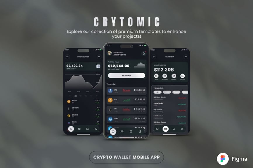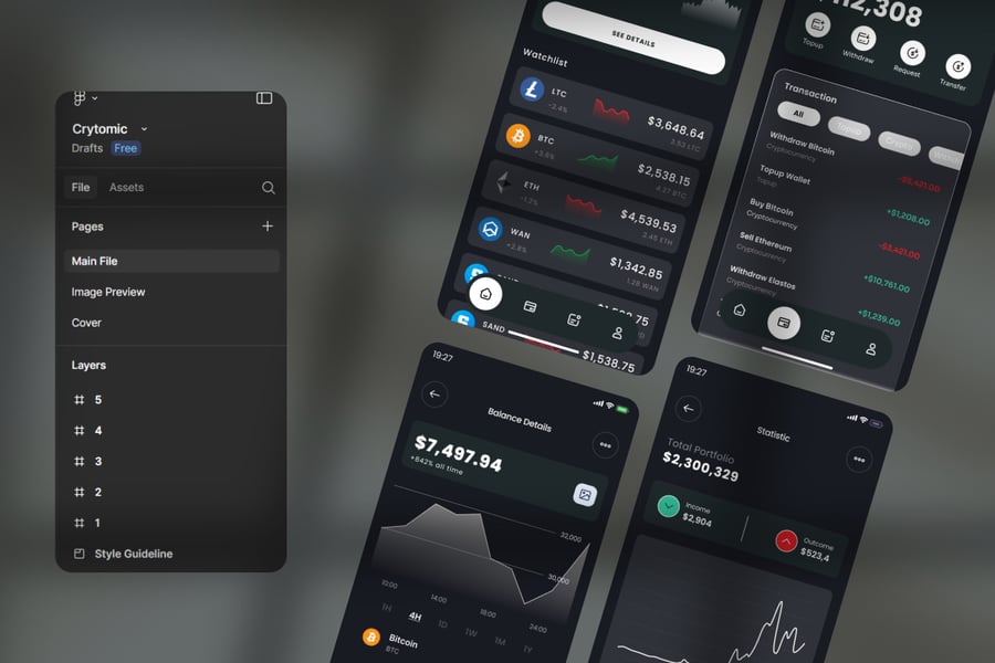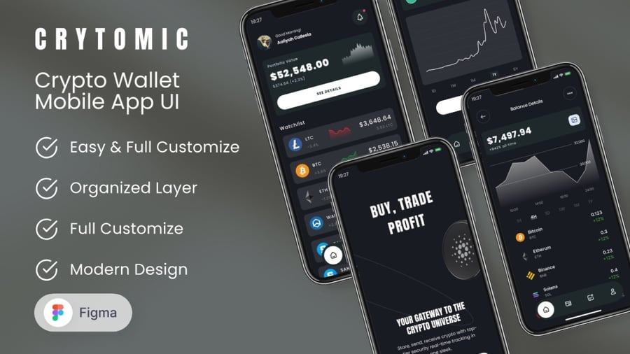 Crytomic – 一款加密钱包移动应用 UI 套件,设计简洁、优雅且现代,包含高质量屏幕。它易于定制,可完全满足您的需求。在 Figma 中也易于使用。