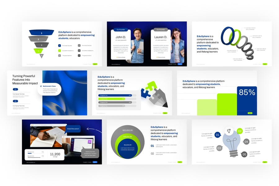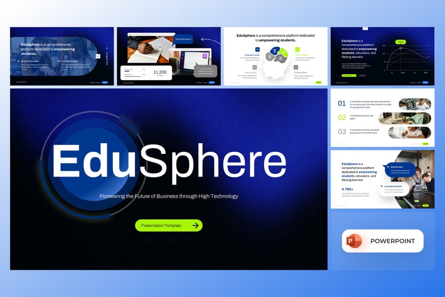 EduSphere PowerPoint模板是一款简洁、专业且充满科技感的演示文稿模板,专为教育和在线学习领域而设计。凭借其清晰的布局、蓝绿色调和现代化的信息图表,该模板非常适合展示学术平台、教育创业公司、在线学习系统和机构报告。EduSphere将科技与教育相结合,提供数据驱动的可视化图表和流程图,帮助传达学习成果、学生参与度和创新教学方案。其未来感十足的设计为任何教育或商业演示带来清晰度、可信度和影响力。