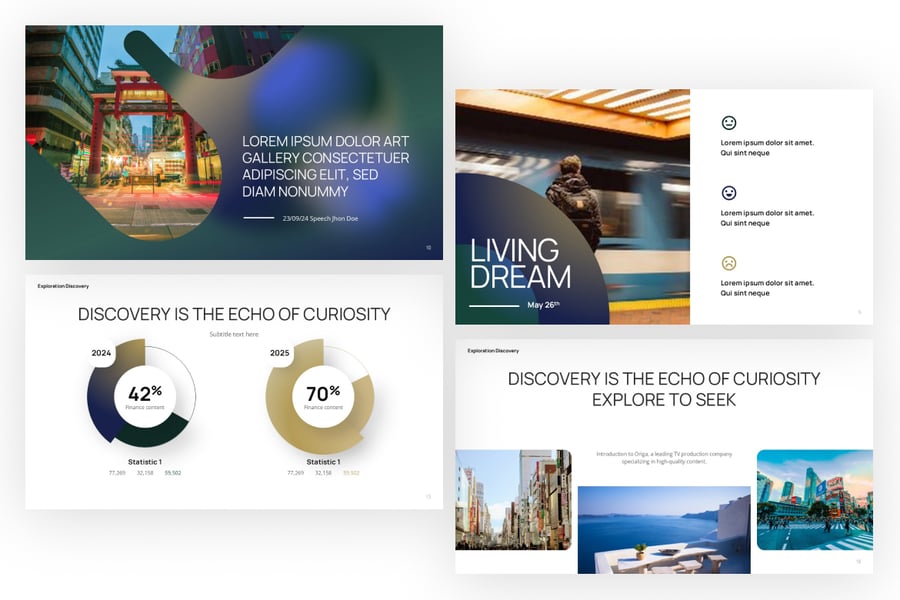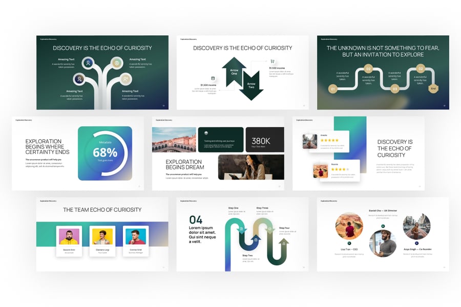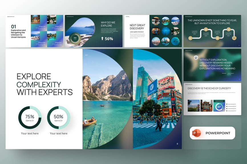 这款“探索与发现”PowerPoint模板是一款视觉效果极佳的演示工具包,旨在展示旅程、发现和项目探索。它包含各种幻灯片,涵盖信息图表、分步流程、团队介绍、数据可视化和以图像为主的布局。该模板完美适用于旅行、研究、创新项目或商业探索,它将现代设计与专业布局相结合,并可在PowerPoint中完全编辑,方便您轻松自定义颜色、文本、图像和图标。