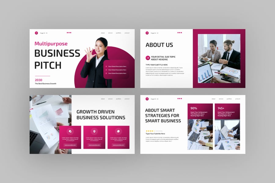 10 张独特的幻灯片,简约优雅的布局,可编辑的母版幻灯片,矢量图标,流畅的过渡效果,商务报告部分,时间轴和路线图页面,可自定义颜色的主题,以及现代的排版对齐方式