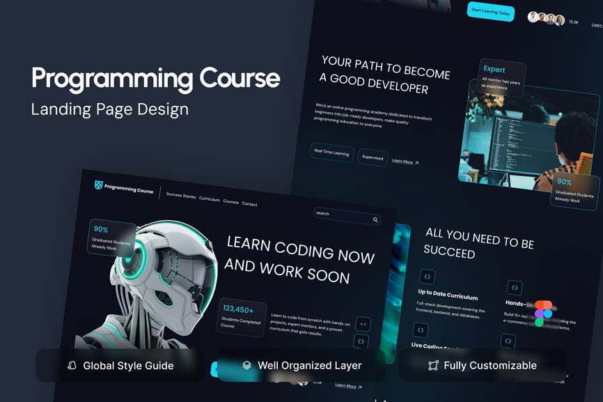 下载编程课程着陆页模板,推广您的编程课程,吸引学生,并建立强大的数字教育影响力。