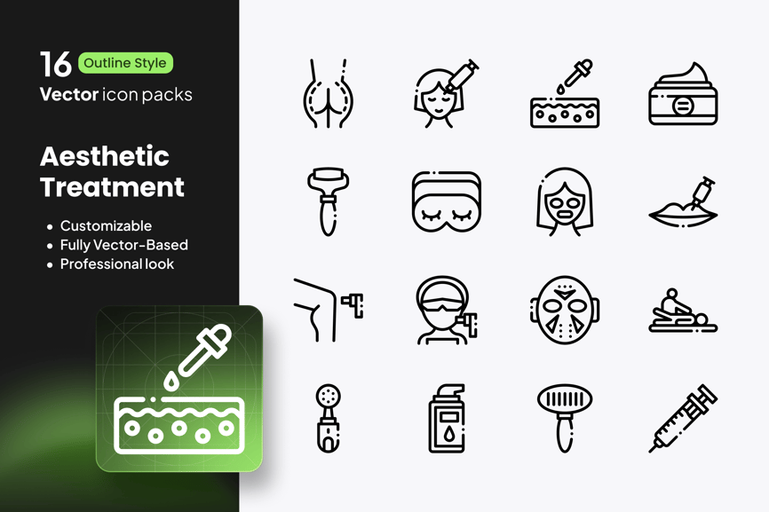 – 16 个美容护理图标(面膜、注射器、精华液、水疗中心、仪器、乳霜、工具)