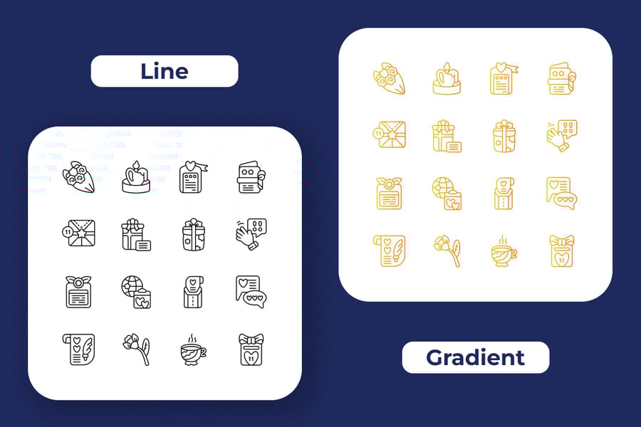 一套现代且用途广泛的图标包,适用于网站、移动应用、书籍、社交媒体、信息图表、传单、印刷品、横幅、海报等多种用途。包含 64 个图标,分为 4 种样式:线条、实心、双色调和渐变。