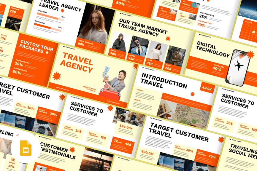 使用这款旅行社谷歌幻灯片演示模板,给投资者留下深刻印象,并清晰传达您的愿景。此演示模板专为旅行社、旅游运营商和酒店业专业人士设计。它能帮助您以完美的视觉效果和信息平衡,展示目的地亮点、旅游套餐、行程安排和客户体验。模板包含多种幻灯片布局,涵盖公司简介、服务项目、定价方案、季节性促销活动和客户评价——所有内容都旨在吸引并留住您的观众。