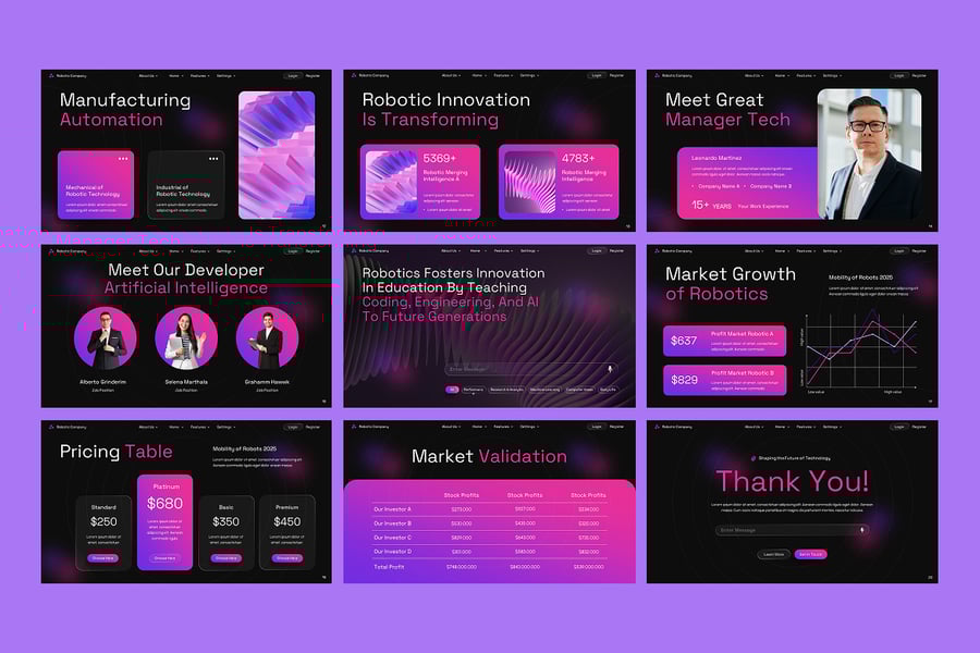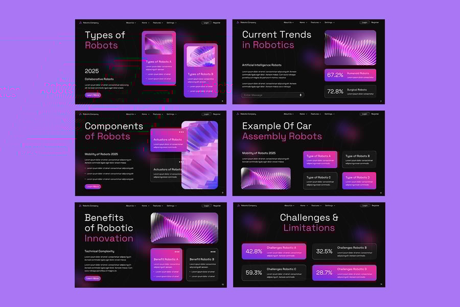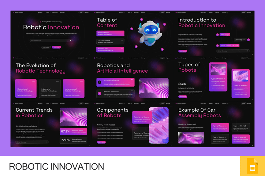 使用这款机器人创新主题的 Google 幻灯片演示模板,让您的下一场技术演示焕然一新。该模板采用未来感十足的专业设计,专为科技、人工智能、机器人和自动化行业打造。它完美适用于展示机器人项目、创新策略、创业路演、研究成果和智能技术解决方案。这款现代化的 Google 幻灯片模板拥有简洁的布局、动态的视觉效果和信息图表,能够突出数据驱动的内容和技术进步。借助完全可编辑的幻灯片、矢量图标、图表和图像占位符,您可以在几分钟内轻松自定义演示文稿。