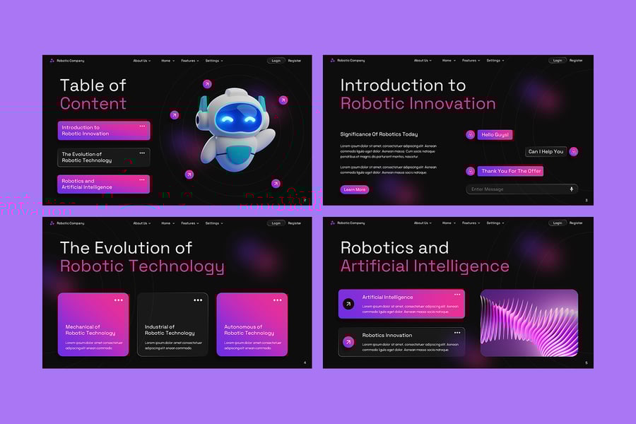 无论您是在科技峰会上发表演讲、推介人工智能产品,还是讲授机器人系统,这款模板都能以简洁前卫的风格吸引眼球,激发创新。它提供精心设计的幻灯片,用于展示贵公司的概况、问题分析和解决方案。凭借现代化的设计、引人入胜的视觉效果和可自定义的图表,它能有效提升故事叙述和数据可视化效果。这款模板适用于任何行业,助您打造引人注目、效果显著的精彩演讲。它尤其适用于人工智能技术、机器人、机器学习、初创公司路演和研究报告等主题。
