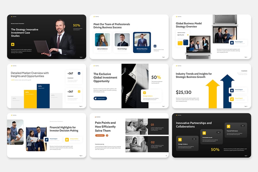 **商业投资者演示模板** 是一套精心打造、极具影响力的演示工具包,旨在帮助初创公司、成长型企业和企业团队自信地向投资者、利益相关者和董事会展示他们的愿景。该模板采用简洁现代的设计风格,巧妙地将引人入胜的故事叙述与数据驱动的洞察相结合,使您能够清晰有力地传达您的价值主张、财务预测、市场战略和发展路线图。