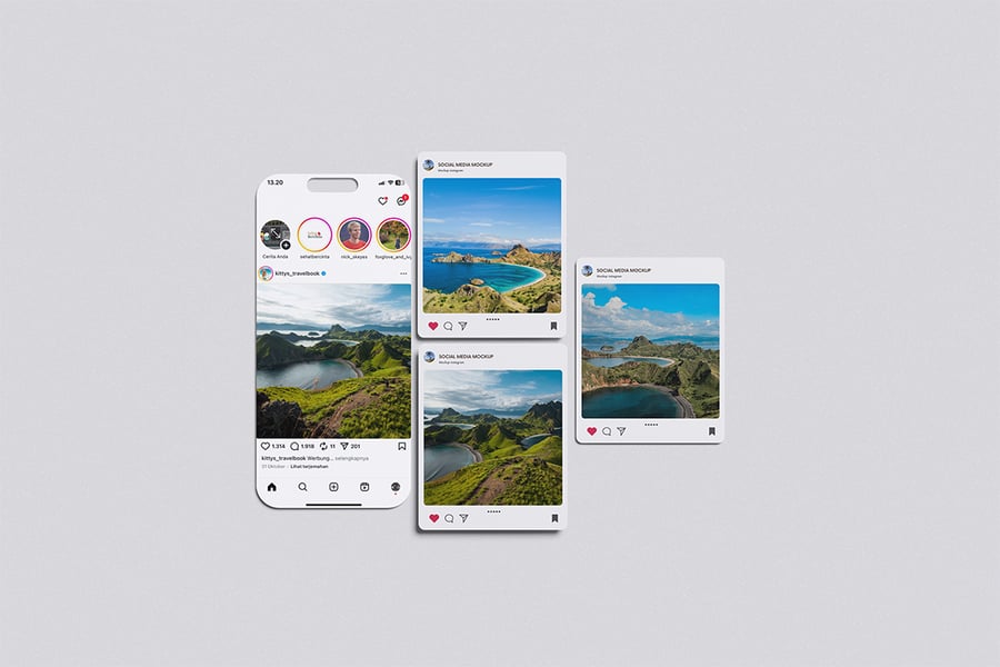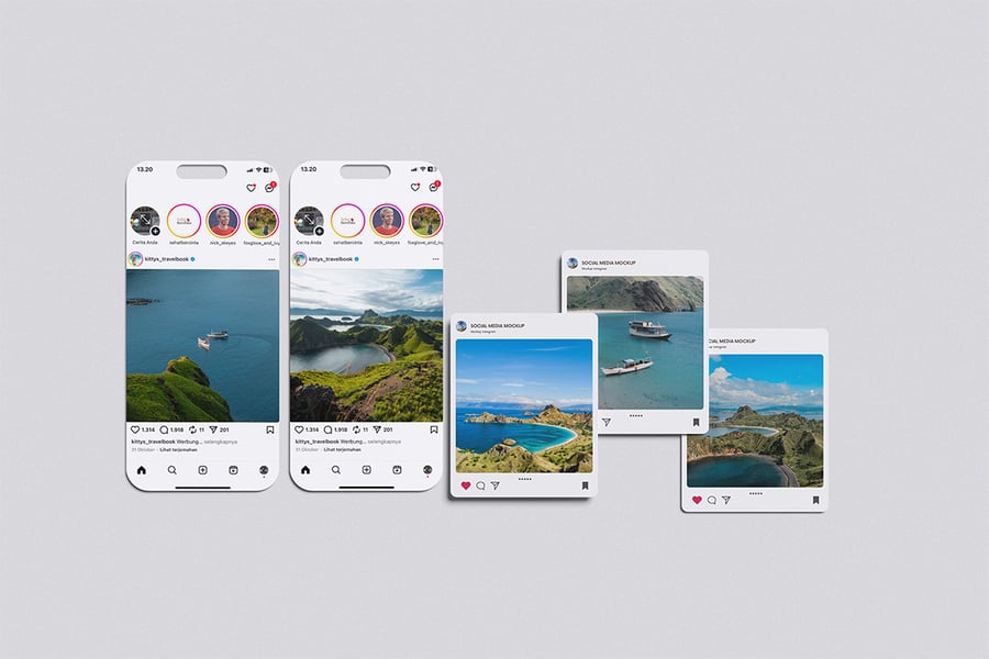 用这些精美的素材样机展示您高质量的 Instagram 社交媒体样机设计。此样机包含 4 个元素,并配有分层清晰的 PSD 文件。此外,此样机还采用了智能对象功能,这意味着您只需几秒钟即可轻松快捷地将当前设计替换为您自己的设计。