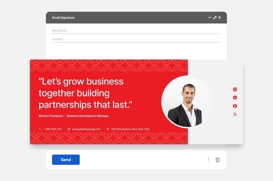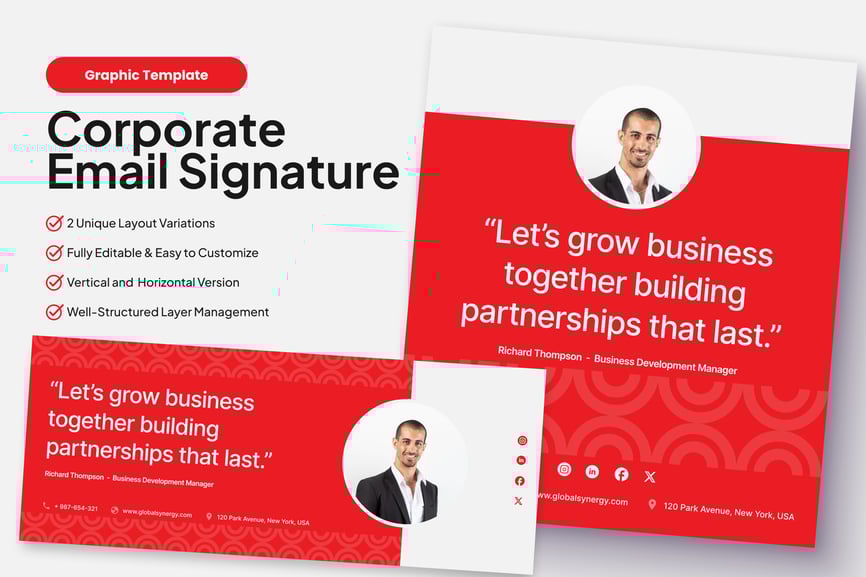 这款专业现代的企业电子邮件签名模板旨在提升您的商务沟通体验。该模板提供两种独特的布局(垂直和水平),简洁的字体和巧妙的色彩对比,在每封邮件中建立信誉度和品牌一致性。