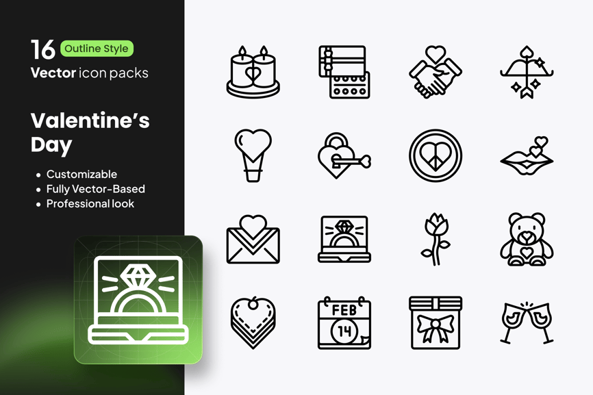 用这套情人节图标庆祝爱情吧!它包含 16 个简洁的轮廓风格矢量图标,涵盖心形、礼物、戒指、气球、香槟、情书和浪漫符号,是贺卡、婚礼邀请函、社交媒体帖子、活动宣传或节日设计的理想之选。