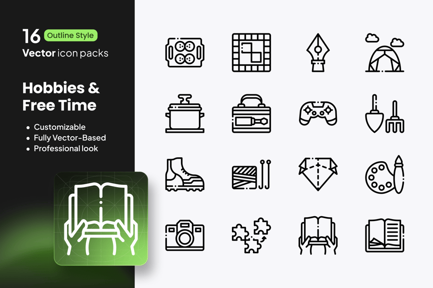 – 16 个爱好和休闲图标(书籍、音乐、画笔、球、相机、植物、游戏手柄)