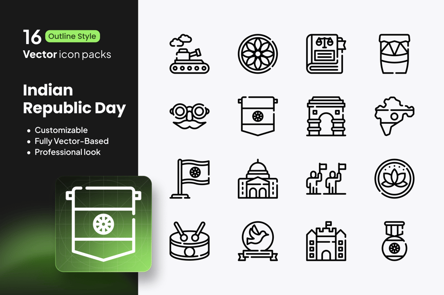 – 16 个共和国日图标(国旗、阿育王法轮、游行、印度门、鼓、庆祝活动)