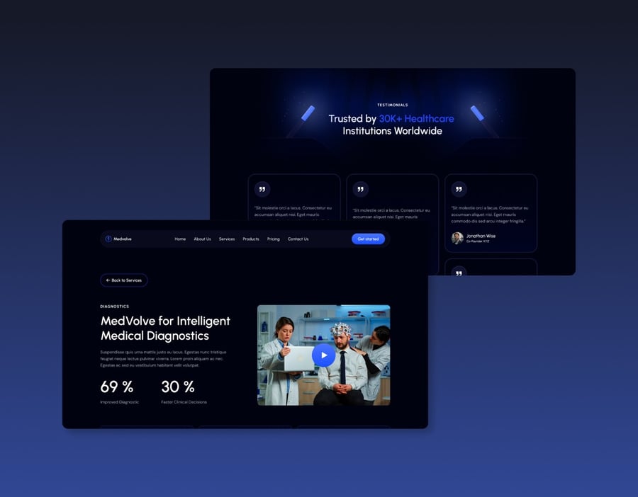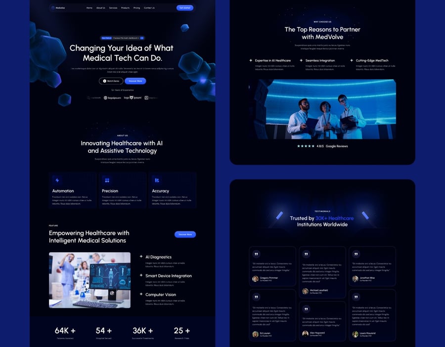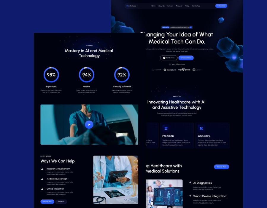 Medvolve 是一款简洁时尚的深色系医疗及辅助技术网站模板套件,专为 Elementor 设计,适用于现代医疗保健机构、医疗初创公司、人工智能诊所和科技创新者。它拥有未来感十足的深色界面和专业的布局,是展示尖端医疗解决方案、人工智能设备和健康科技服务的理想之选。该套件包含响应式页面,性能优化,无需编码即可轻松自定义。对于希望打造优雅可靠的在线形象,彰显创新和专业能力的医院、实验室、医疗科技开发商和研究中心而言,Medvolve 是理想之选。
