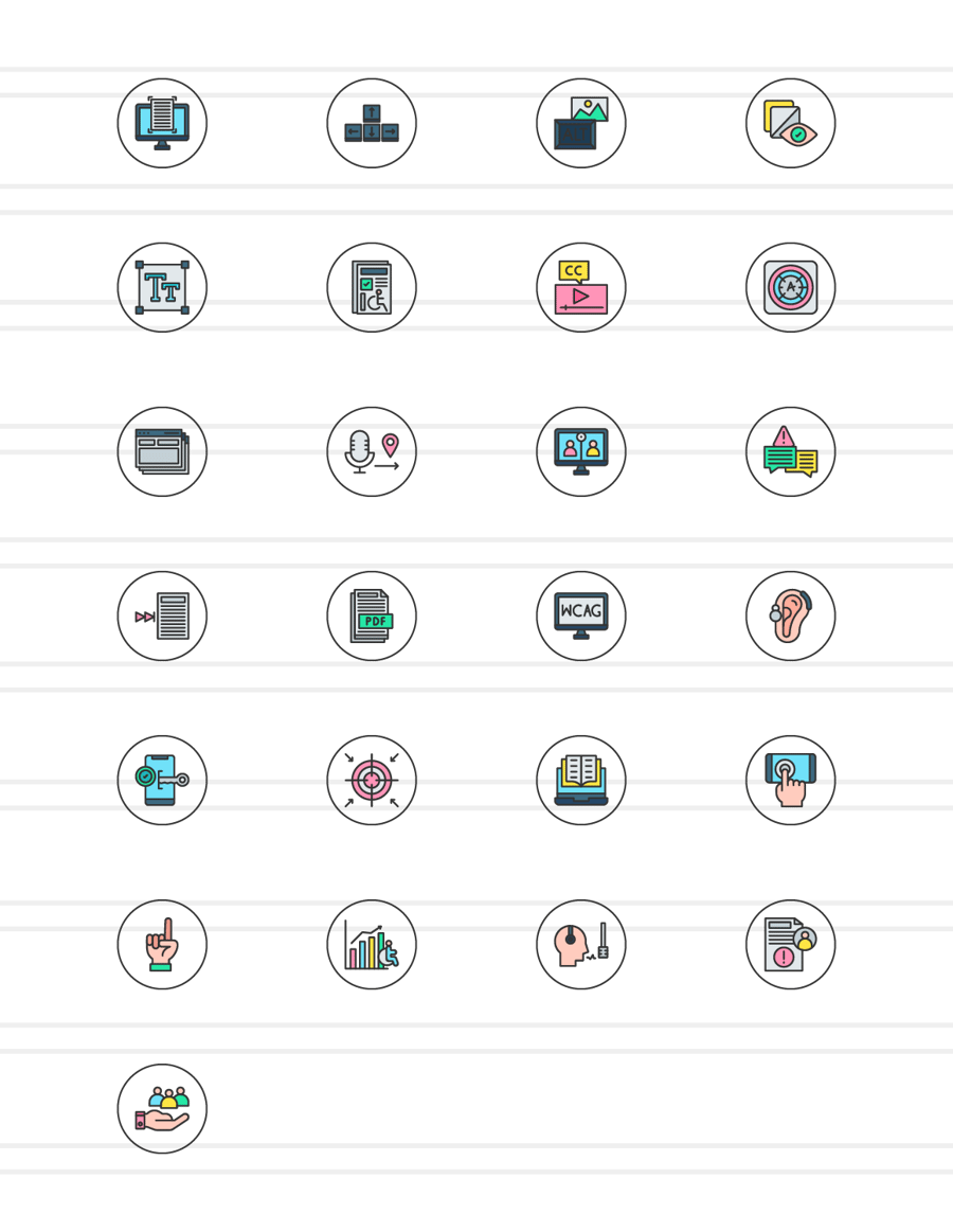 每个图标都采用简洁的轮廓和专业的外观设计——非常适合网页设计师、应用程序开发人员、教育平台和专注于无障碍设计的数字机构。