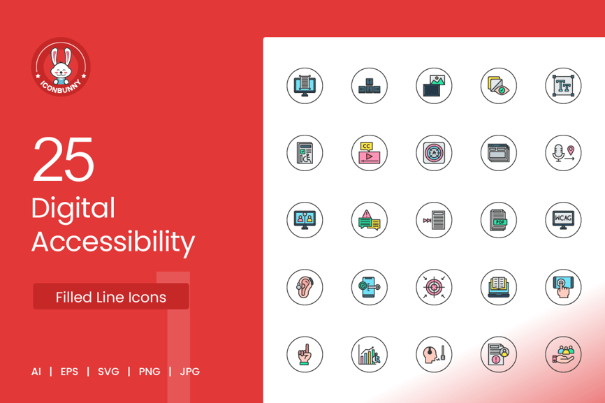 使用这套数字无障碍图标集,打造包容性数字内容。该图标集包含 25 个现代时尚的矢量图标,代表无障碍、包容性设计、辅助技术和对所有用户的可用性。